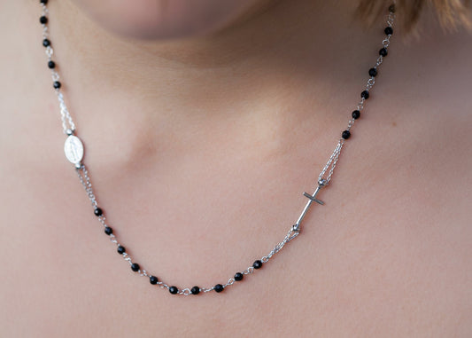 Halskette mit Rosenkranz aus 925er Silber, schwarz