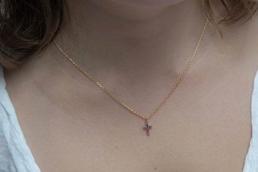 Kette Kreuz bunte Steine vergoldet - Kreuzkette