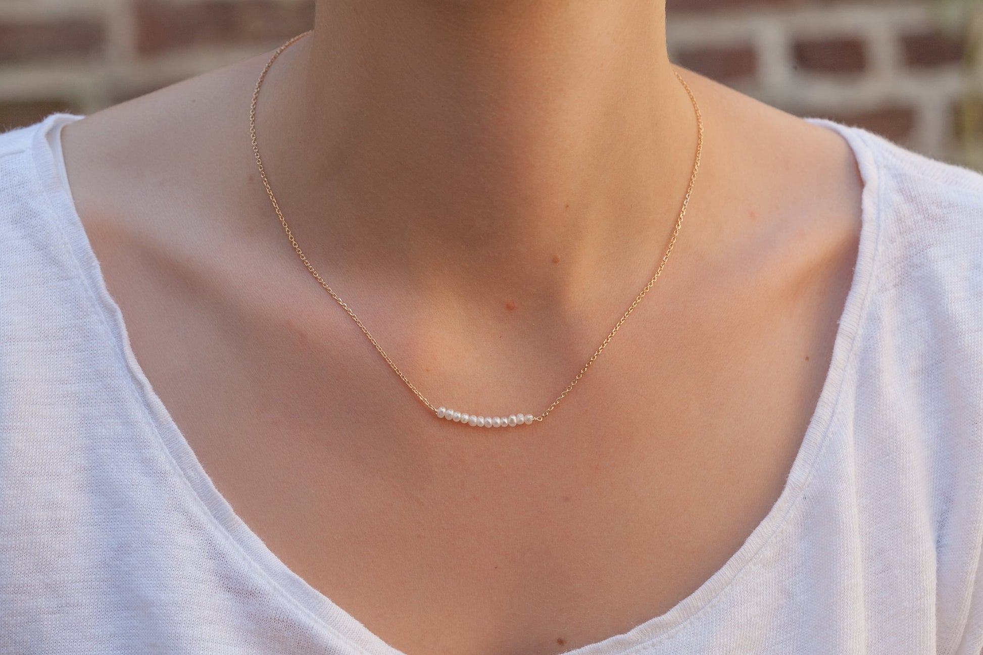 Sehr schöne feine vergoldete Halskette mit 12 kleinen perlweißen Perlen. Allein oder kombiniert mit anderen Halsketten aus meiner Sammlung zu tragen. Unsere 16 Karat vergoldeten Halsketten haben eine Garantie von 10 Jahren.